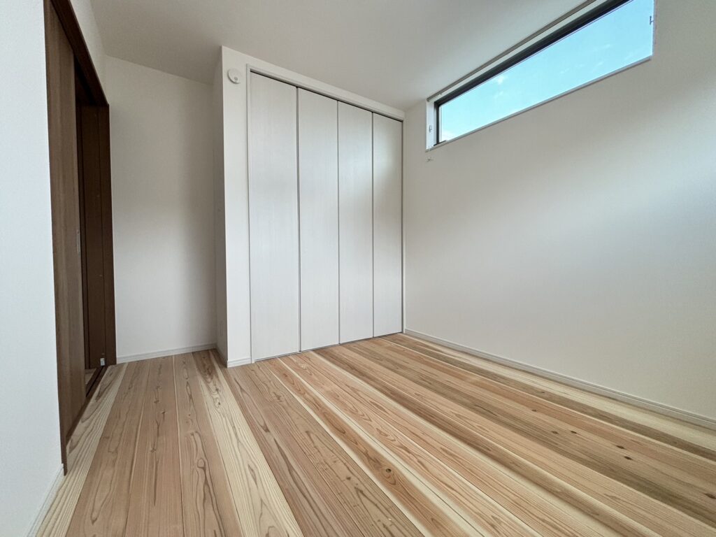 各居室には無垢の杉板を採用しており、最大の特徴は、真冬に素足で触れてもひんやりしない暖かさです。杉のような軽くて柔らかい木は、内部に多くの空気層を含むため、熱を伝えにくい性質があります。一方で傷がつきやすいため、ダイニングテーブルや椅子を置く場所には適していません。また、各居室の窓は、室内からの景色とプライバシーを考慮しながら高さを設定しています。