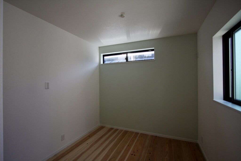 ご夫婦の寝室は奥様のご希望で一面をアクセントクロスで仕上げました。ベットがくる位置の背面にはニッチという窪み作りさらにコンセントを設けました。携帯を充電したり飲み物を置いたりと使い勝手のよい棚として活用頂いています。